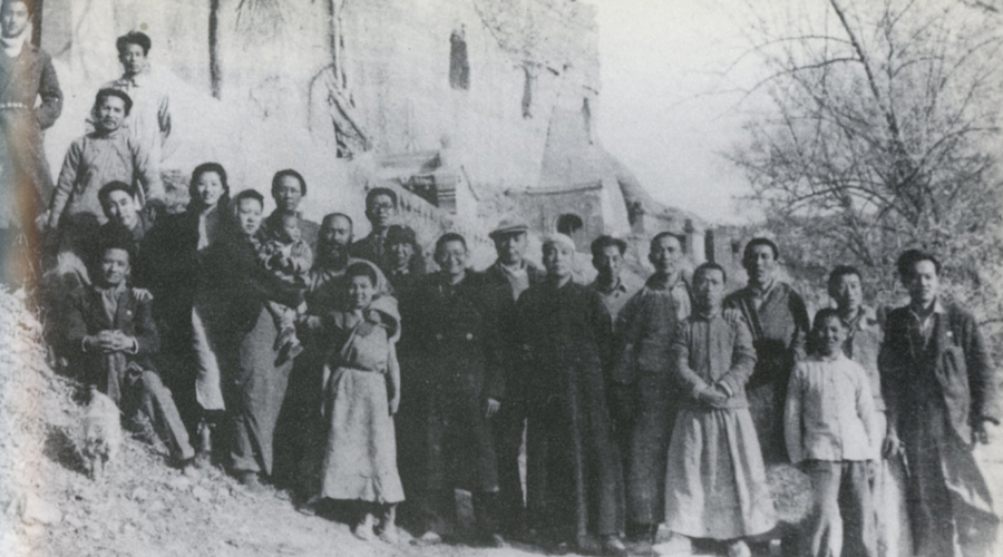 1943 年,张大千(第二排右十)与向达(第二排右五)、常书鸿(第三排右一)、史岩(第三排右二)、谢稚柳(第二排右七)、萧建初(第二排右一)、张心智(左一)合影于榆林窟