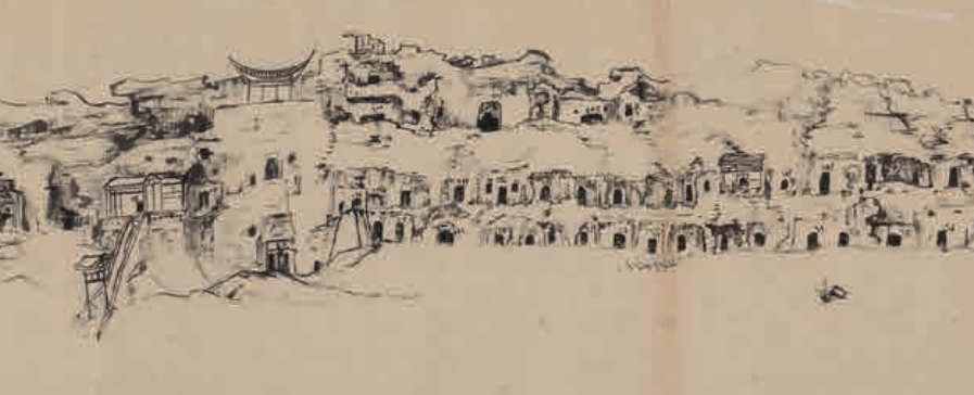 初次公开的水墨速写莫高窟崖面立面全景图(局部)四川博物院藏